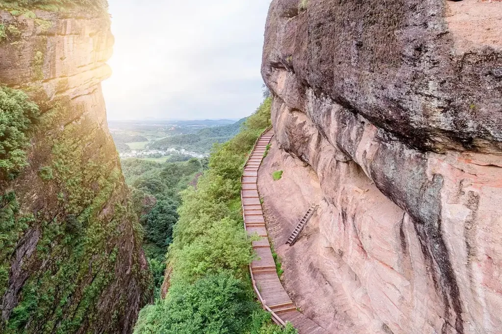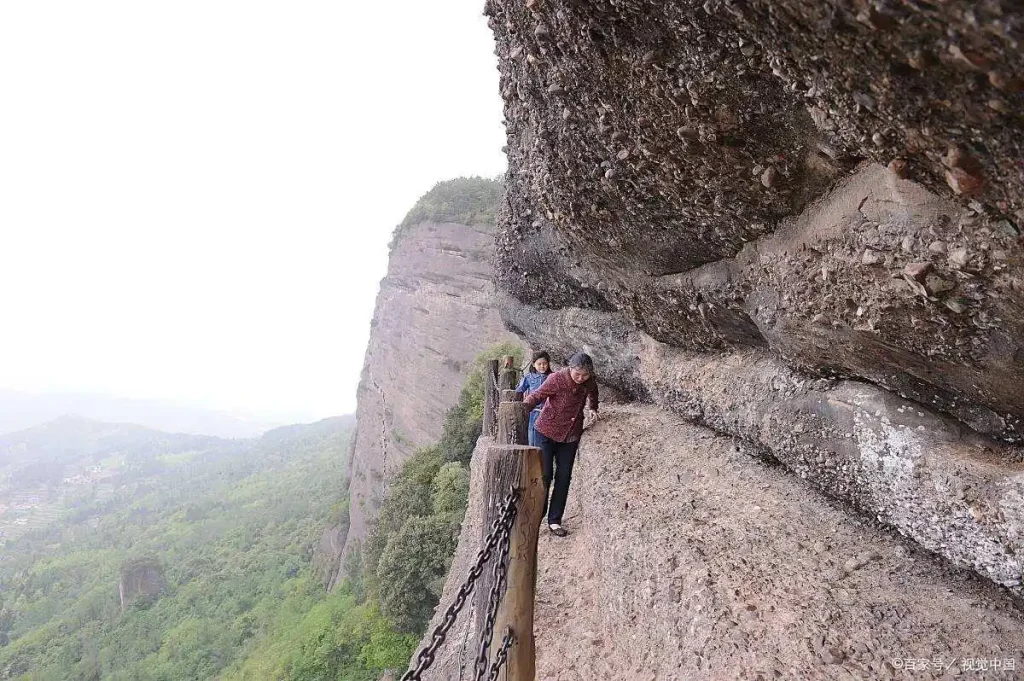 栈道建在峭壁之上,脚下是深不见底的山谷。每走一步,都能感受到桥面轻微的晃动,仿佛随时会塌陷。